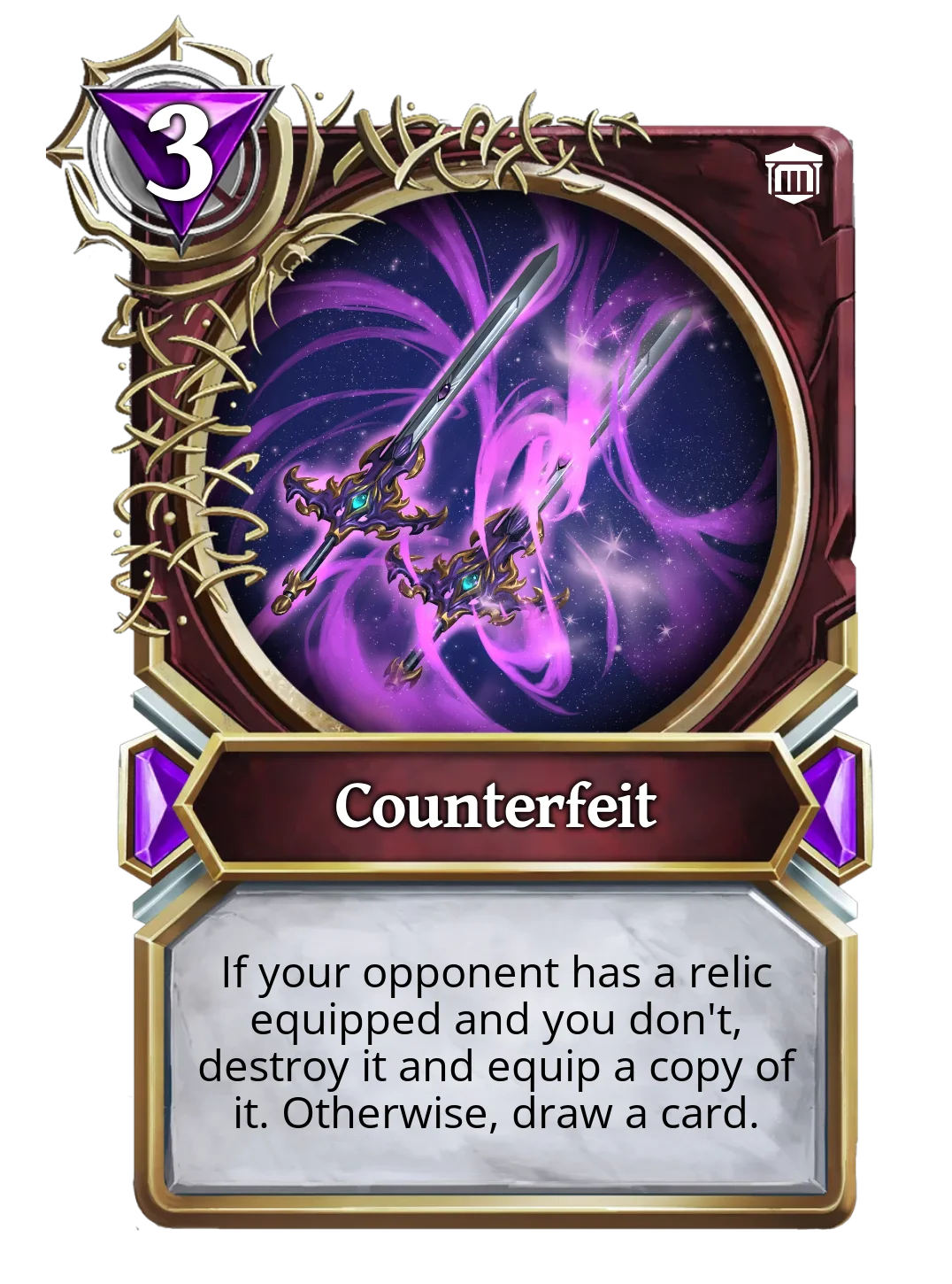 The Counterfeit spell is very interesting and ideal for destroying the opponent's relic, while you equip a copy of that relic, a great deception spell as usual.