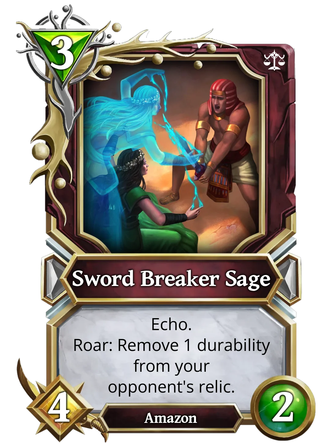 I'm currently using Sword Breaker Sage in my Amazon deck, it may only remove 1 durability when summoned, but it has the echo effect, so I can have another copy of this creature, one that costs 1 mana, to remove 1 more durability from the enemy relic.