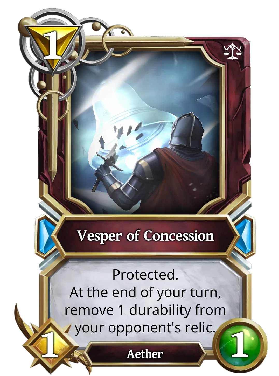 Vesper of Concession removes only 1 durability from the opponent's relic at the end of its owner's turn. And Spellbound Goblin, is the creature that removes the most amount durability of a relic, it can remove up to 5 durability from the opponent's relic.