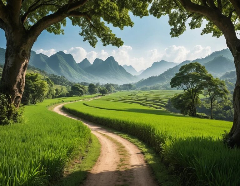 Beyond the fields, the terrain gently rises, leading to a majestic backdrop of layered mountains, rendered in soft shades of blue and green, suggesting distance and atmospheric perspective. The sky above the mountains is a light, clear blue, with hints of bright sunlight. The overall impression is one of tranquility, natural beauty, and an inviting journey into the heart of nature. The lighting is soft and diffused, highlighting the rich textures of the leaves and the vibrant greens of the fields, creating a peaceful and immersive natural scene.***