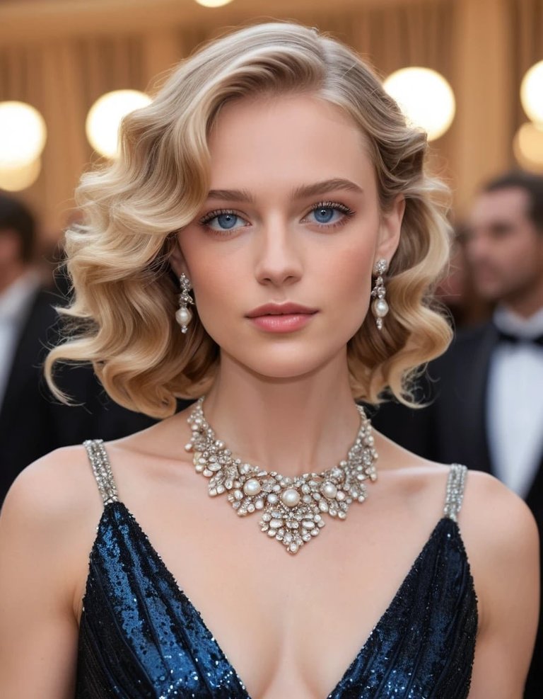 ***A stunning and glamorous close-up portrait of a young woman on a red carpet or at a high-profile event, captured with a professional camera such as a Sony Alpha 1 paired with a G Master 85mm f/1.4 lens, ensuring sharp focus on her and a beautifully blurred background. She possesses voluminous, perfectly styled blonde hair, cascading in soft, bouncy curls around her shoulders. Her blue eyes are captivating, enhanced by delicate eye makeup, and her lips are painted a soft, natural pink.