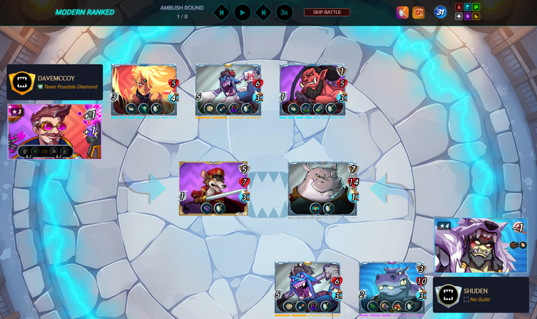 In this battle, both players have Venka in their lineup. Player davemccoy had his Venka in the middle of the team and had lower health units to attract Opportunity attackers. His opponent, shuden's Venka was in last and was killed immediately by Dave's units with Opportunity ability. Dave's Venka utilized his Piercing ability to further do damage to health after breaking the enemy's armor. Venka's offensive ability is on full display in this battle.