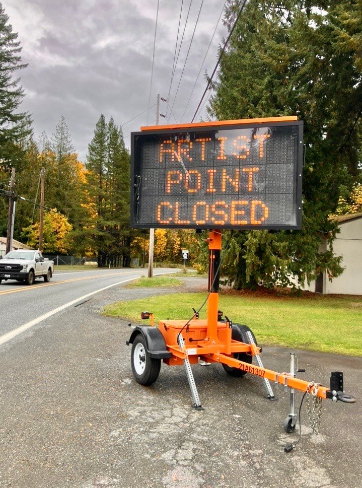 At the main intersection in town, ( the only intersection in town) a large battery powered sign flashed “Artist Point Closed!”😮