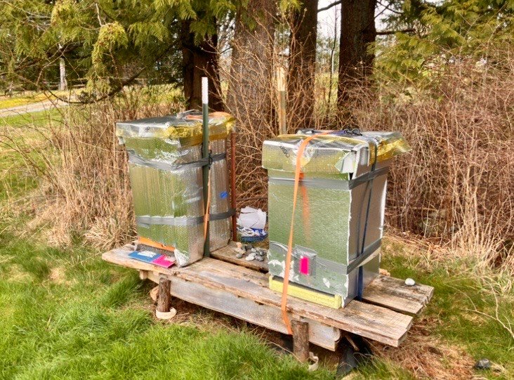 Adam wraps up these Hives with foam, to help keep the Bees warm during the winter.