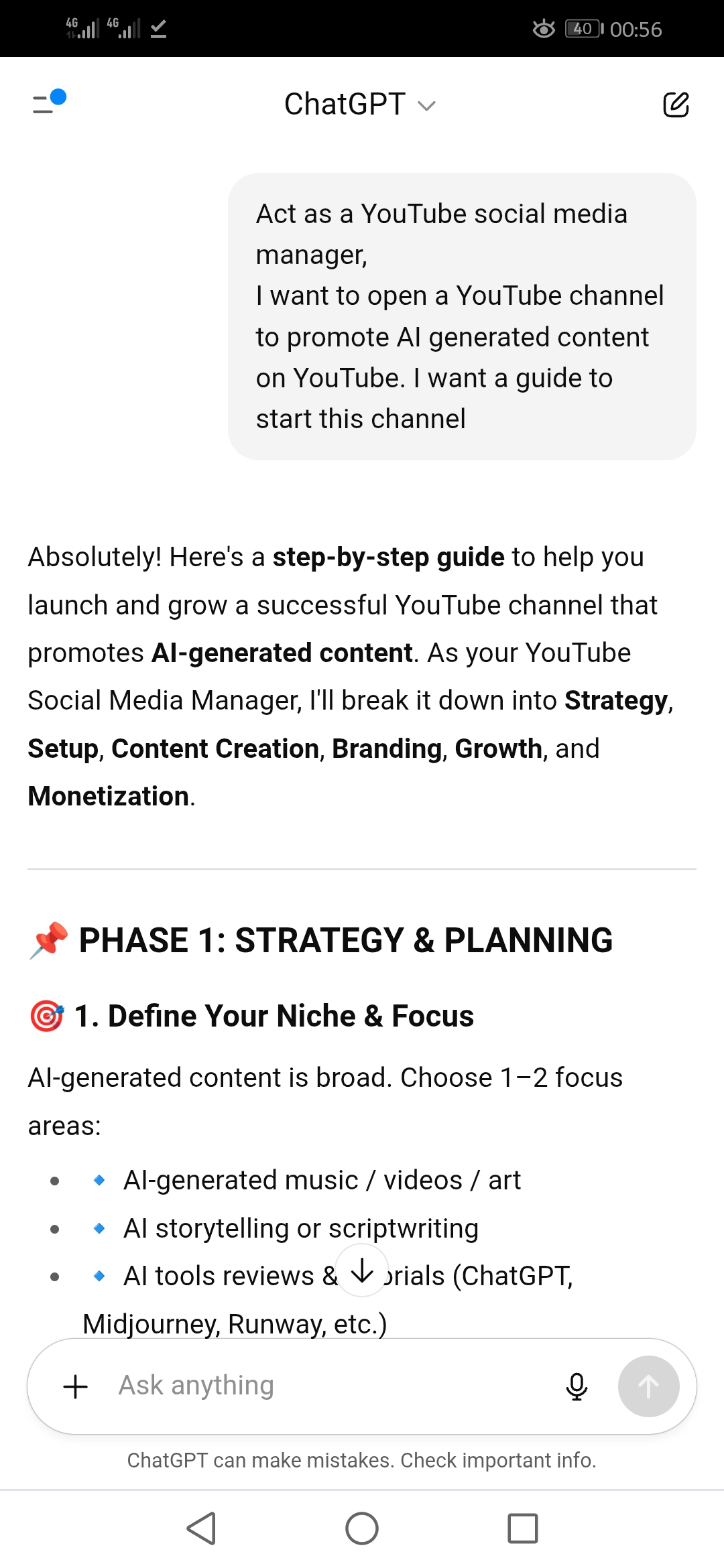 It was a great ideas I got from chatbot I was able to draw the name GenAi. Incorporate with my brand techstyle. If you watch closely on the suggestion you will understand that the Chatbot is actually accurate and acting like a YouTube social media manager.